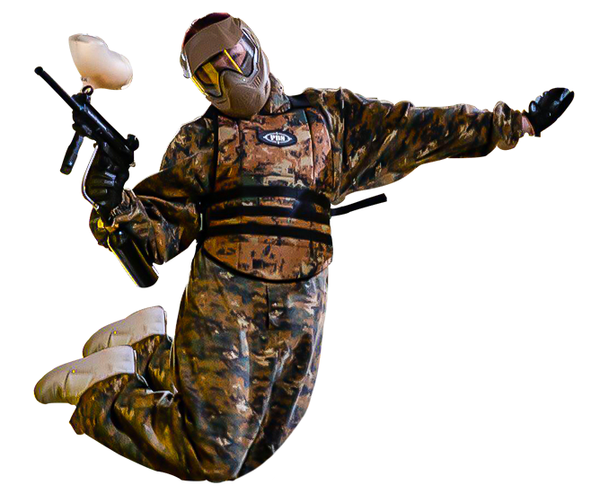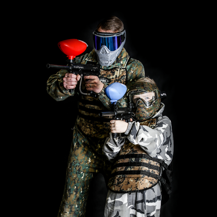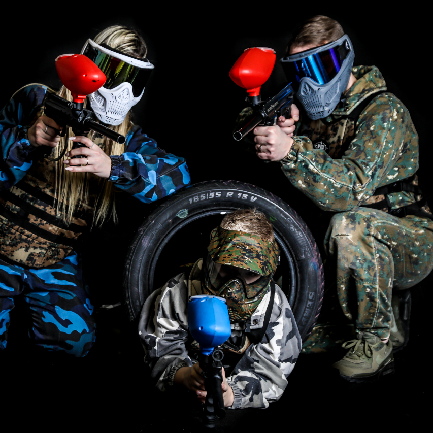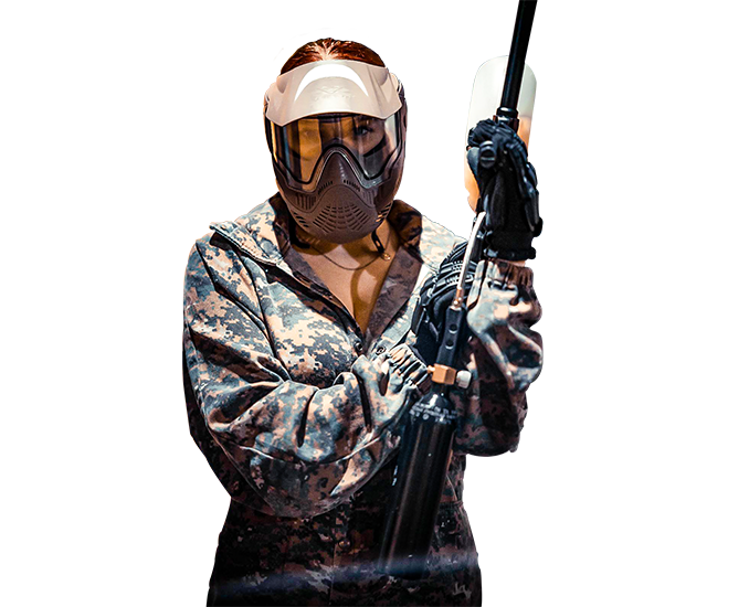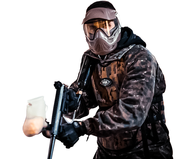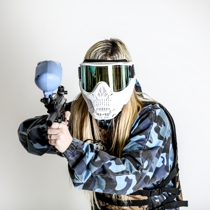 maska, rukavice, nákrčník, kombinéza, ochranná vesta, zbraň, zásobník, bombička/pohon